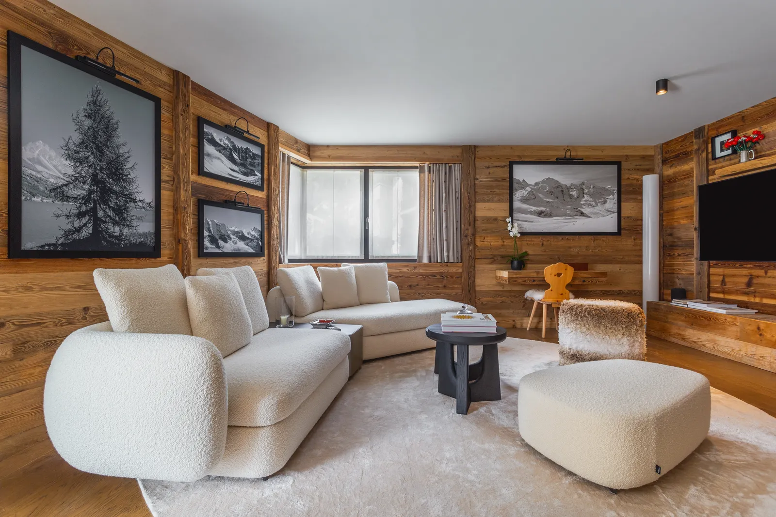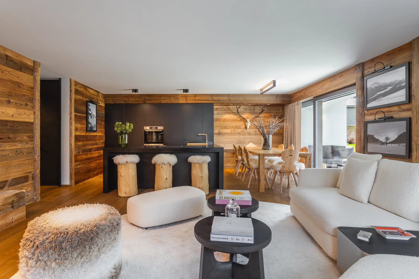 Le vaste espace de vie ouvert réunit salon et salle à manger dans un décor chaleureux ponctué de textures douces et de photographies de paysages alpins. La cuisine, sculpturale, contraste avec un bloc minéral sombre qui apporte une touche graphique forte.